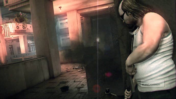 At the same time, presentational touches suggest the curation of the footage. Colours blow out as if you're viewing the action off a worn-down VHS tape, and techniques are deployed to make your interactive decisions in gameplay infect the visuals. Looking directly into the brightest neon lights or burning incandescent bulbs makes the footage flare. An explosion doesn't just fulminate in Kane & Lynch 2's world - it rips through that camera lens too, the footage warping and distorting as a result.