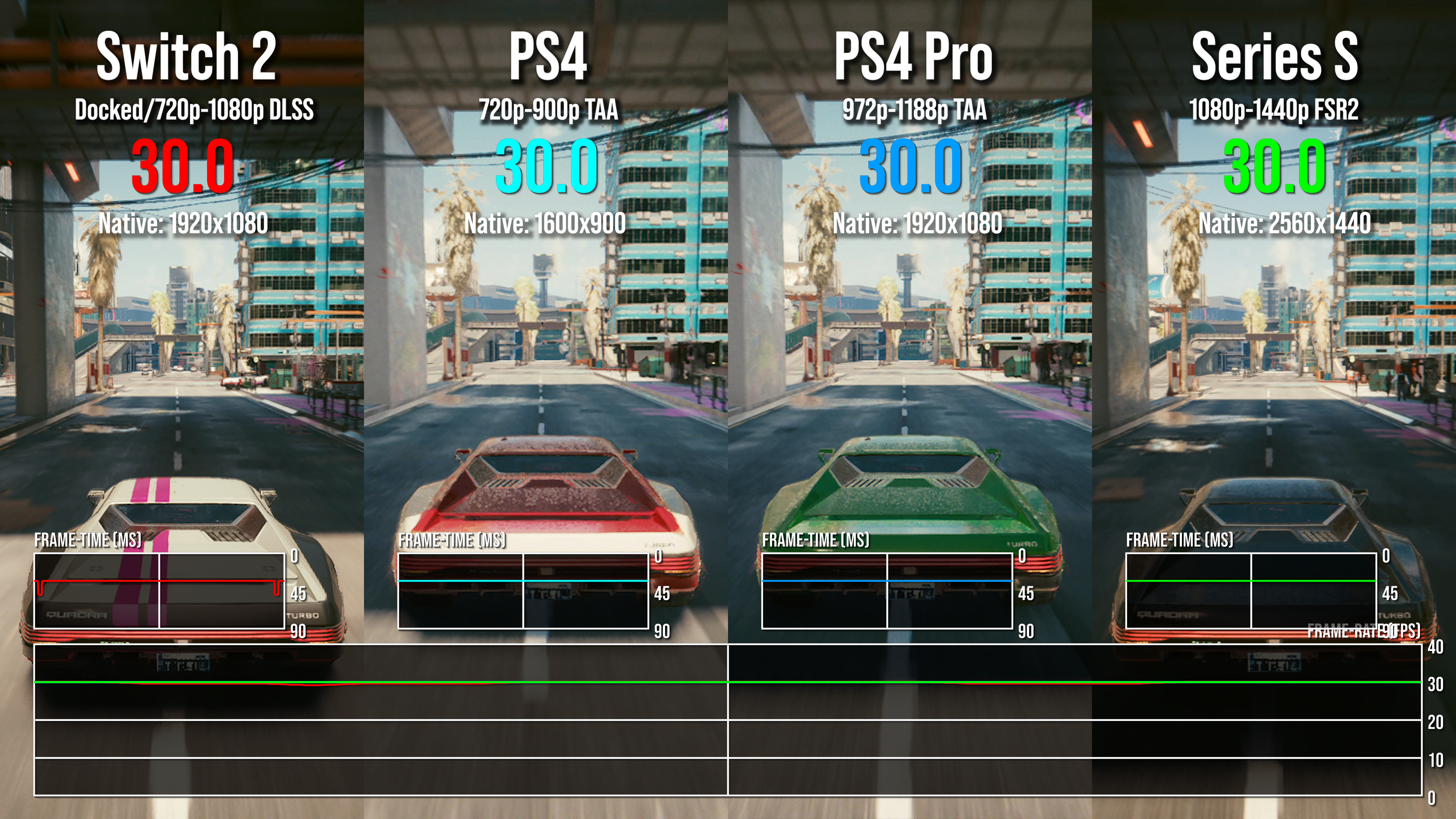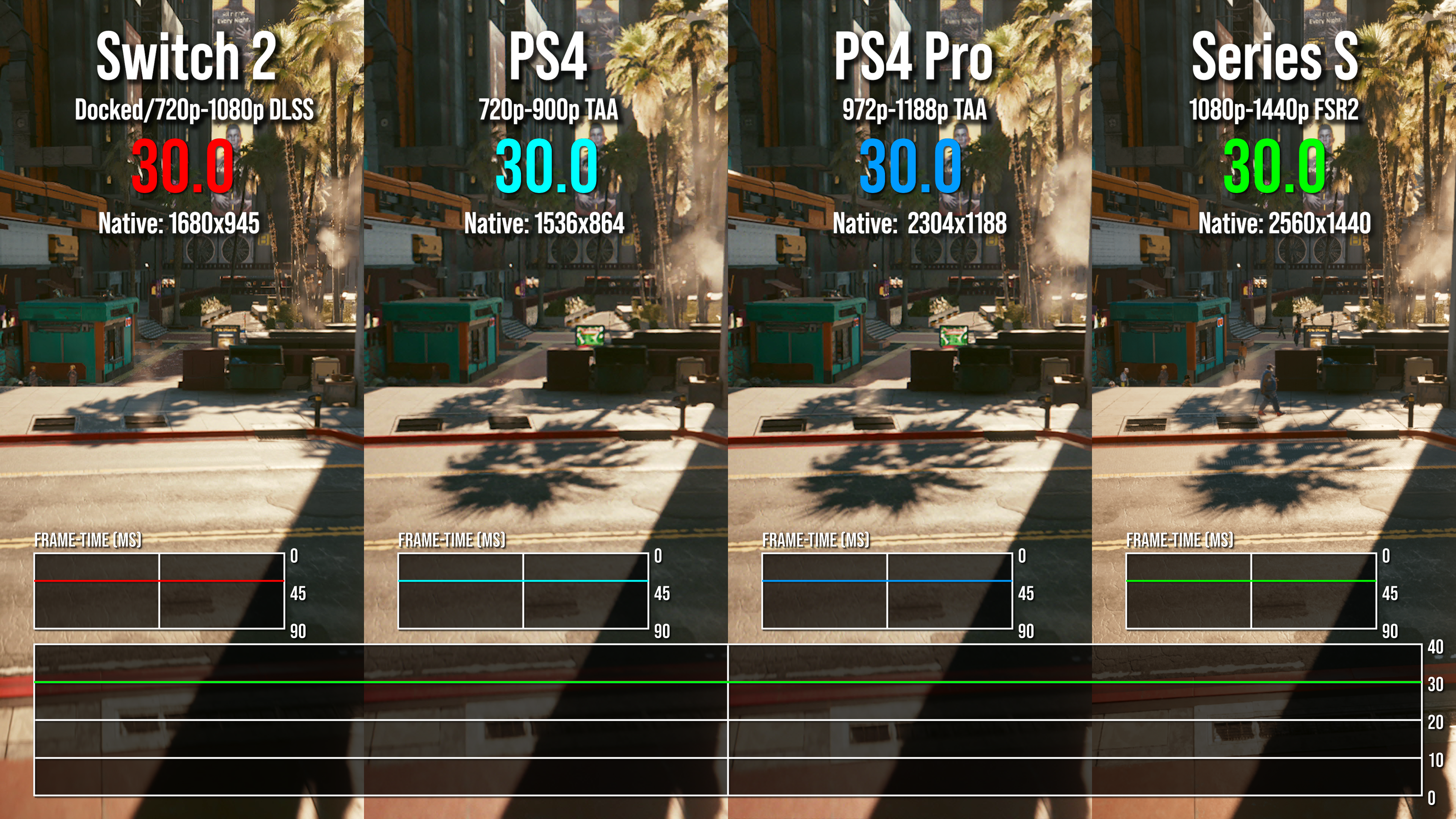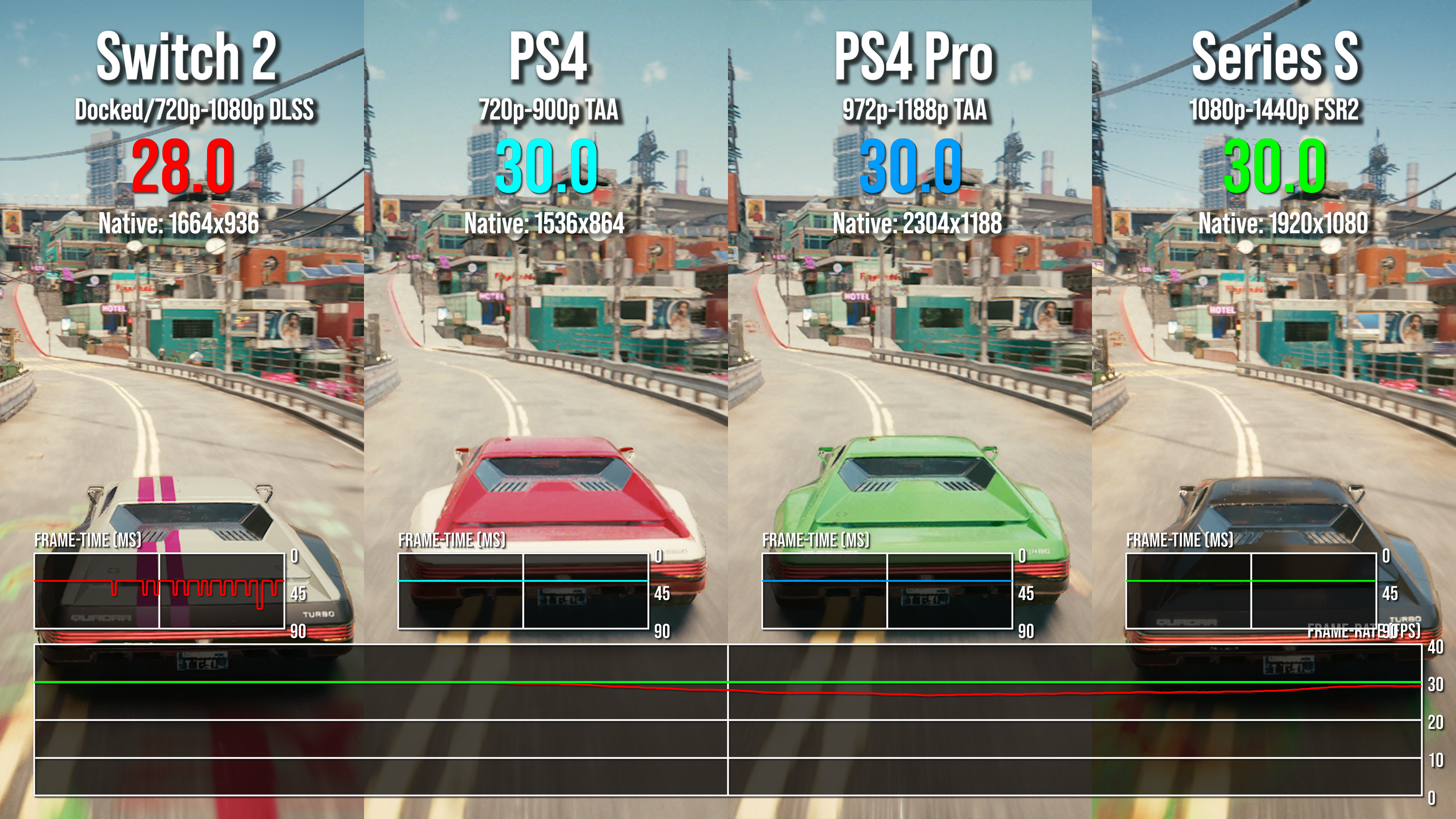Well, this is just one game, remember. A first generation game, no less, and there are key differences in the way that one game has been adapted for the various systems, each of which have their own key differences like unique graphics APIs. We are moving into "a bit of fun" territory here because obviously each system will have different set-ups, different upscalers and more on the software side, while the differences on a hardware level between today's Switch 2, PS4/Pro and Xbox Series S will be vast.