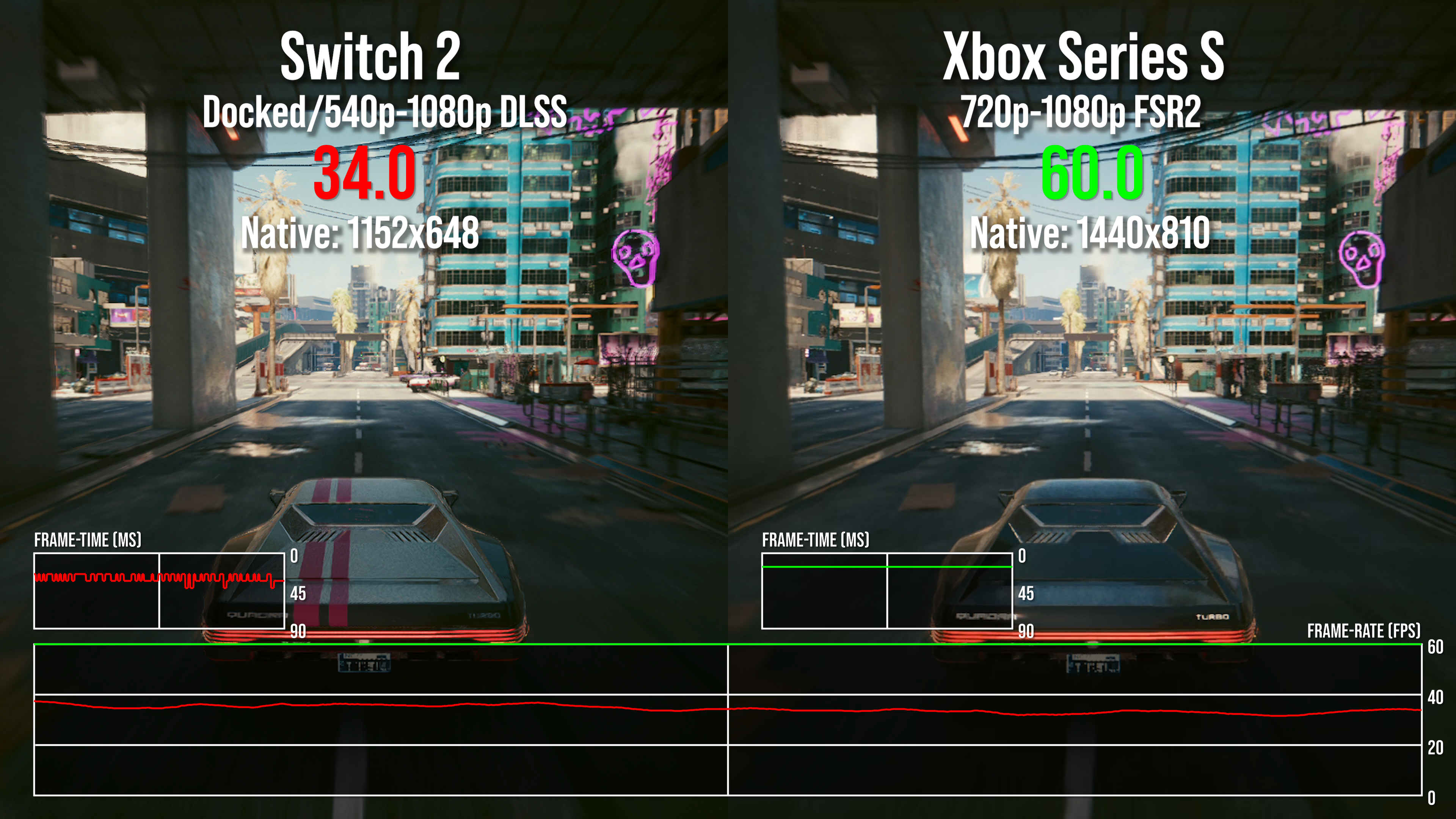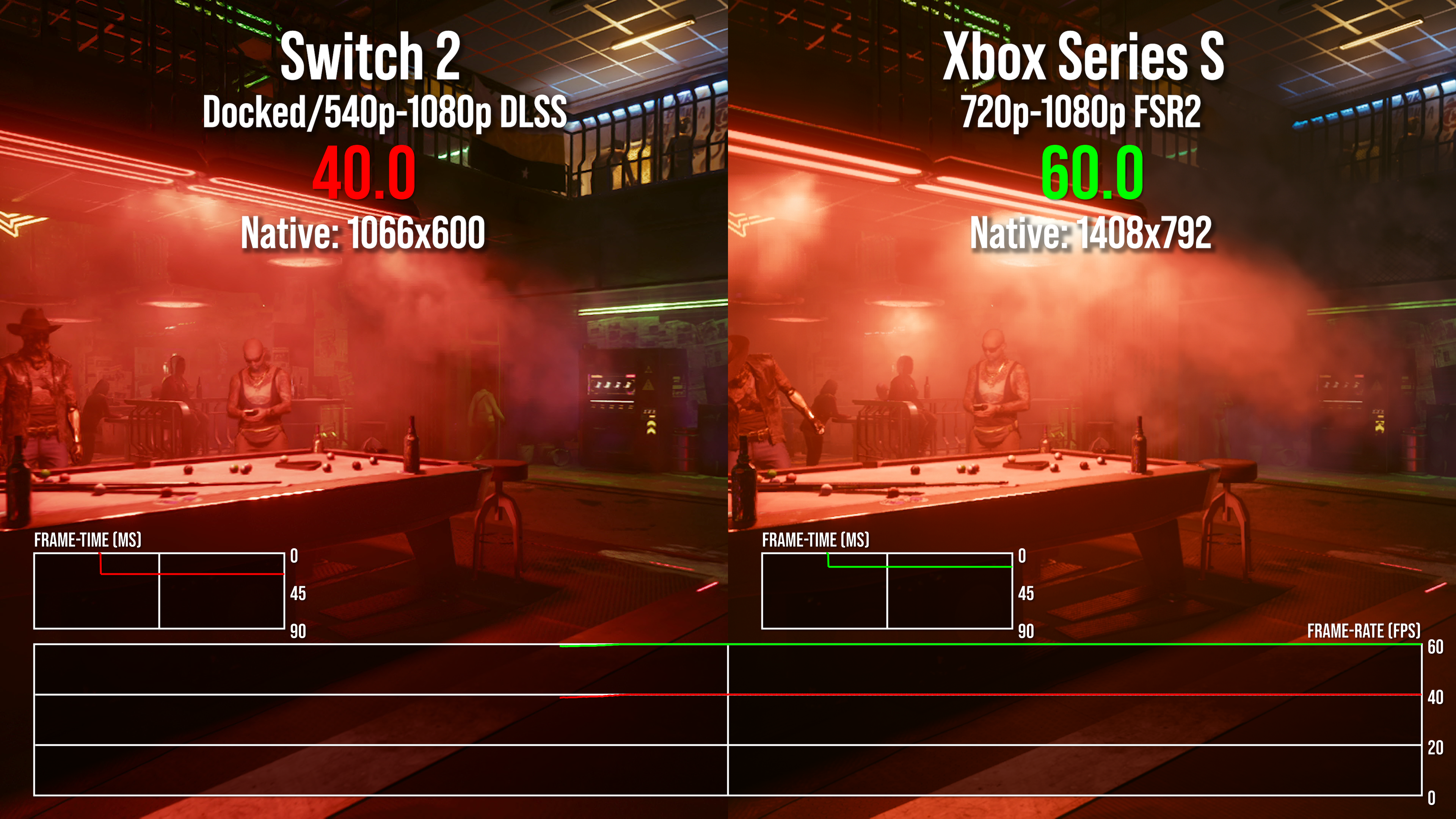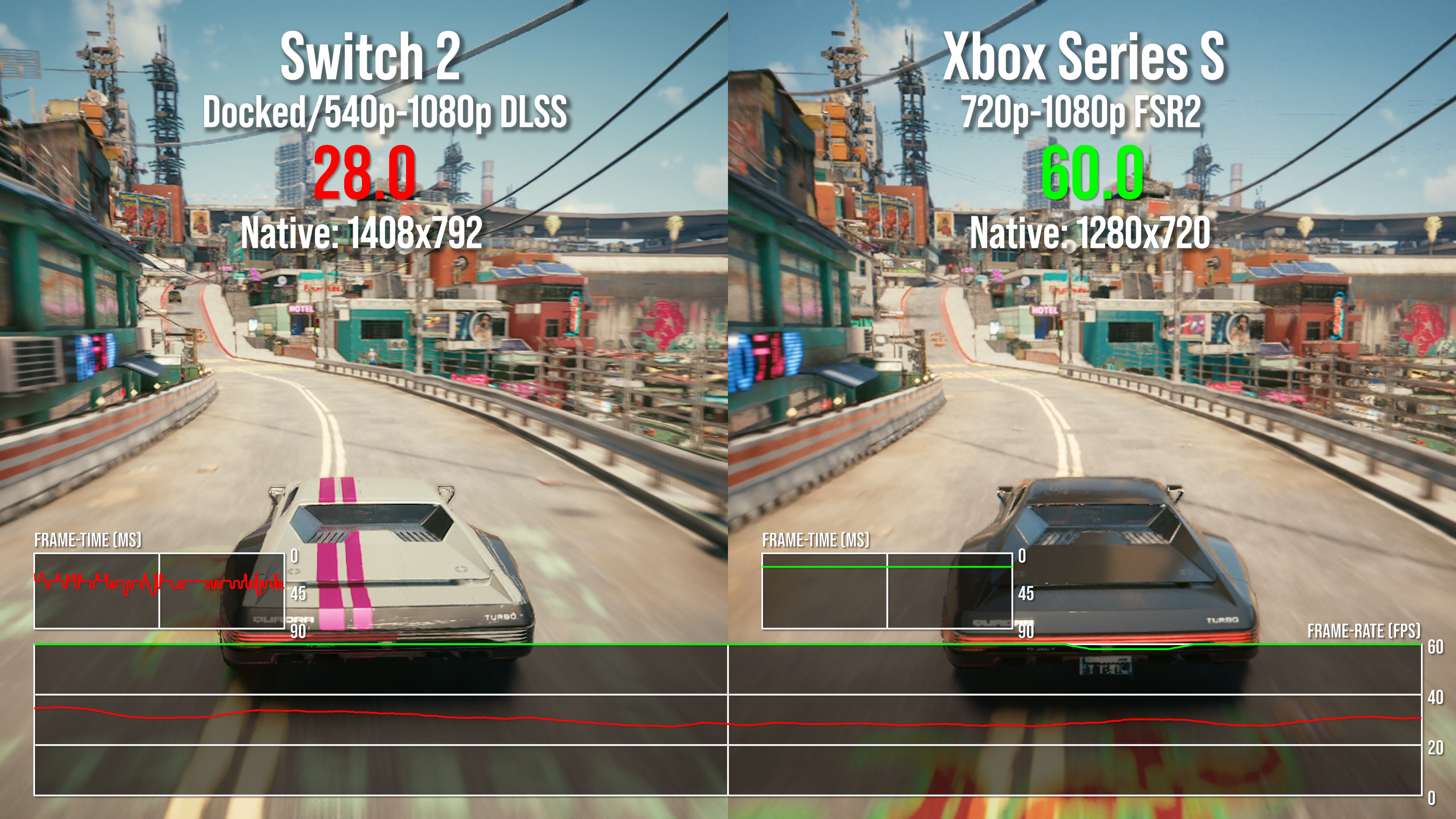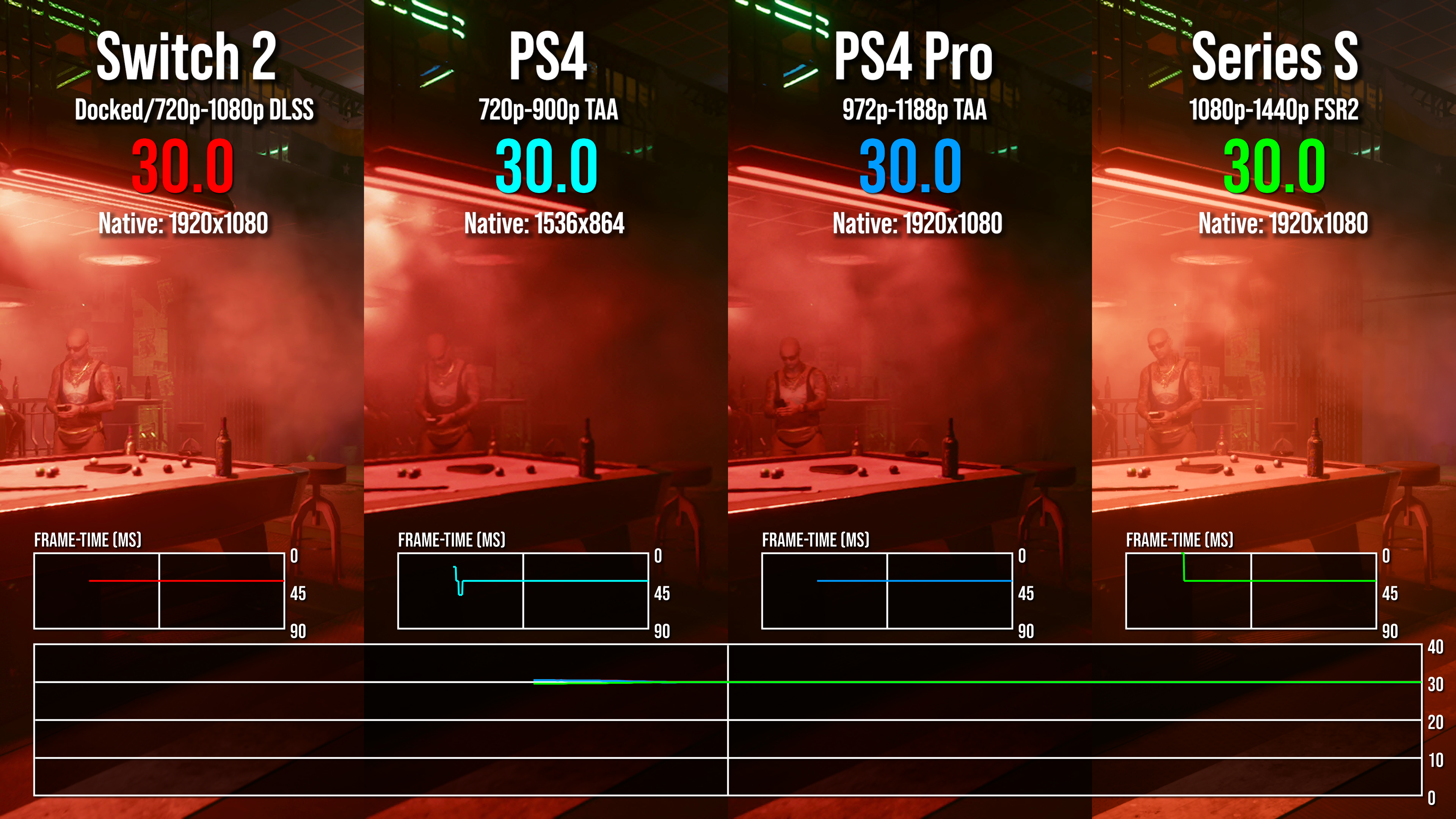 Well, this is just one game, remember. A first generation game, no less, and there are key differences in the way that one game has been adapted for the various systems, each of which have their own key differences like unique graphics APIs. We are moving into "a bit of fun" territory here because obviously each system will have different set-ups, different upscalers and more on the software side, while the differences on a hardware level between today's Switch 2, PS4/Pro and Xbox Series S will be vast.