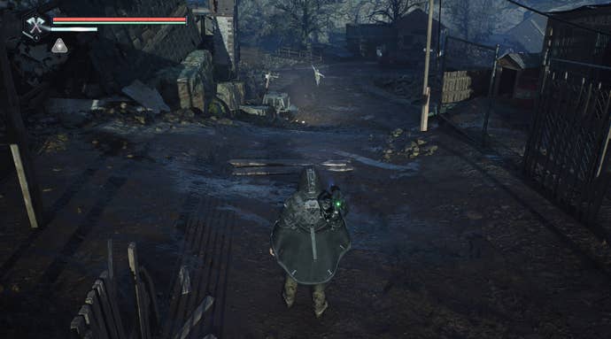 Looking to your right, you'll be able to see crates stacked against a building. Climb up those and drop down to the other side. You now need to head down the hill and then follow the right-hand road.