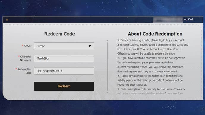 Redeem codes on website