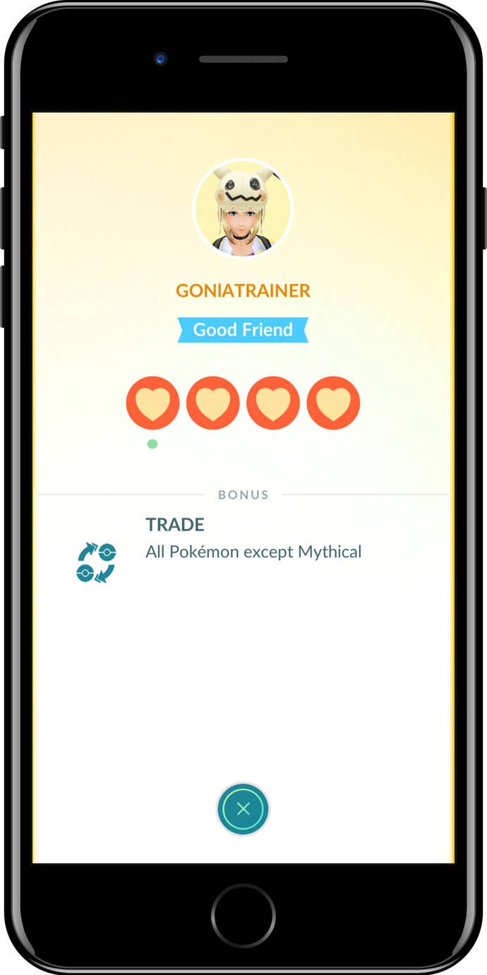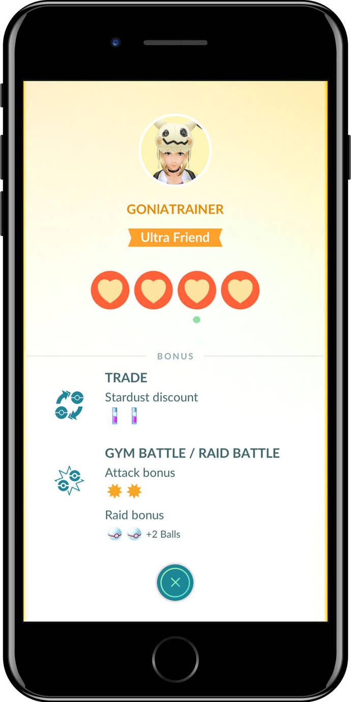 Ultra Friend | 30 | 50,000 XP Medium (0.92x) Stardust discount on Trading Medium (1.07x) Gym and Raid attack bonus 2 extra Premier Balls after raiding together Participating in Trainer Battles at any distance |