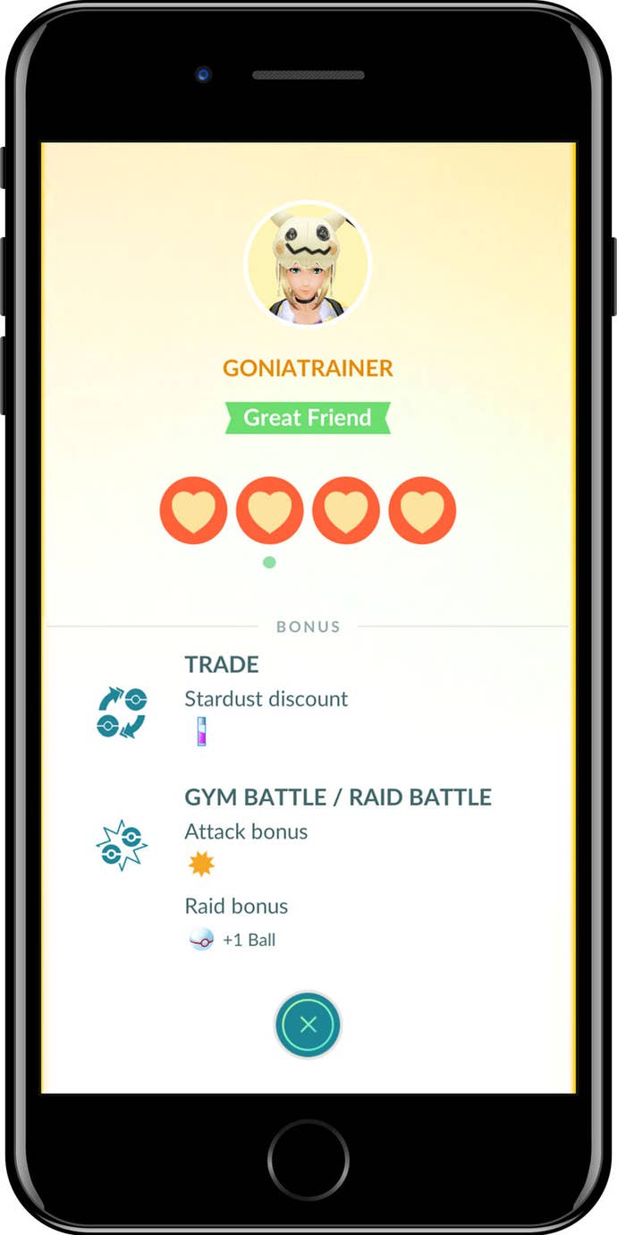 Great Friend | 7 | 3,000 XP Small (0.2x) Stardust discount on Trading Small (1.05x) Gym and Raid attack bonus 1 extra Premier Ball after raiding together |
