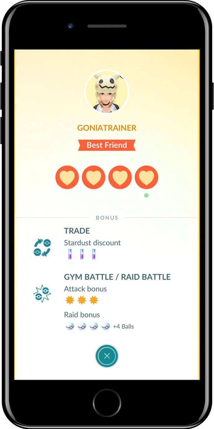 Best Friend | 90 | 100,000 XP Large (0.96x) Stardust discount on Trading Large (1.1x) Gym and Raid attack bonus 4 extra Premier Balls after raiding together Chance to become Lucky Friends |