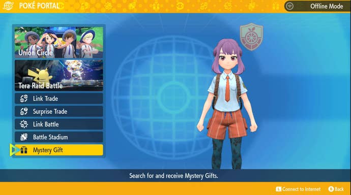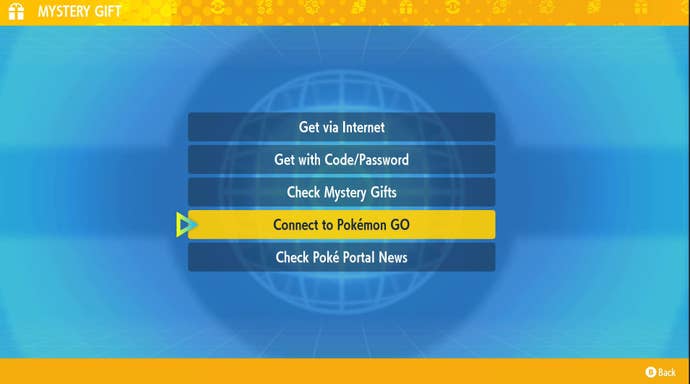 First you need to pair your two devices. To do this, open Scarlet/Violet on your Nintendo Switch. In game, press the X Button to access the in-game menu, then select Poké Portal. Next, select 'Mystery Gift', followed by 'Connect to Pokémon GO' and then 'Pair with a Pokémon GO account'.