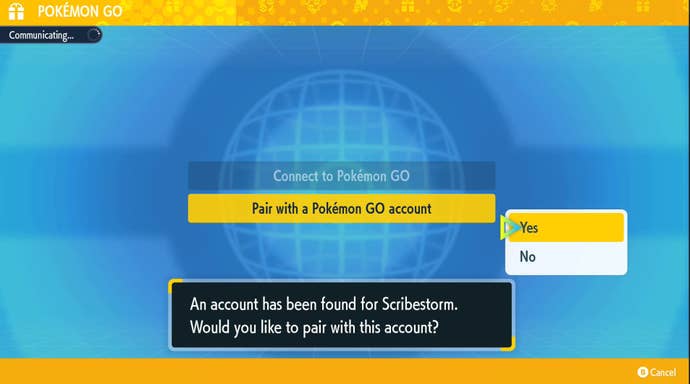 Your game will then search for a Pokémon GO account. Now, in Pokémon Go, click the Pokéball menu and then click Settings at the top right of the screen. Scroll down to Connected Devices and Services, and wait for the two devices to recognise each other. Once your Switch flashes up your Pokémon Go Trainer Name, select 'Yes' to complete pairing.