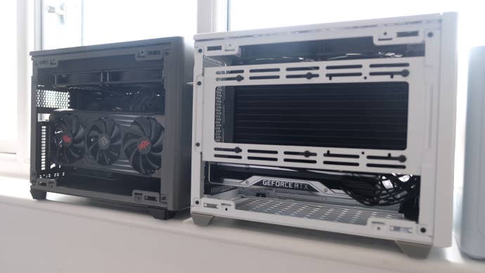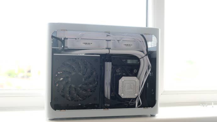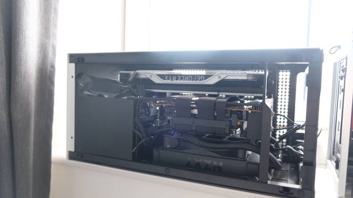 My build: I actually have two NR200P builds, both with modest GPUs and old Ryzen 9 processors to serve as mobile workstations - I used one in the Eurogamer office when writing up Black Friday deals, for example, as I wanted a quicker machine than my laptop at the time and needed something that would fit into a carry-on suitcase. One build, in the standard NR200P, uses a 240mm Asus AiO (as it was on sale for £60) and the RX 6750 XT, while the other is the NR200P Max, which uses the pre-installed 280mm AiO and PSU, and is currently inhabited by the RTX 2060.