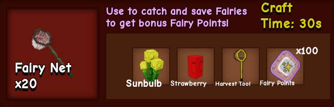 The Fairy Net crafting recipe will create 20 Fairy Nets. It takes 30 seconds and requires: